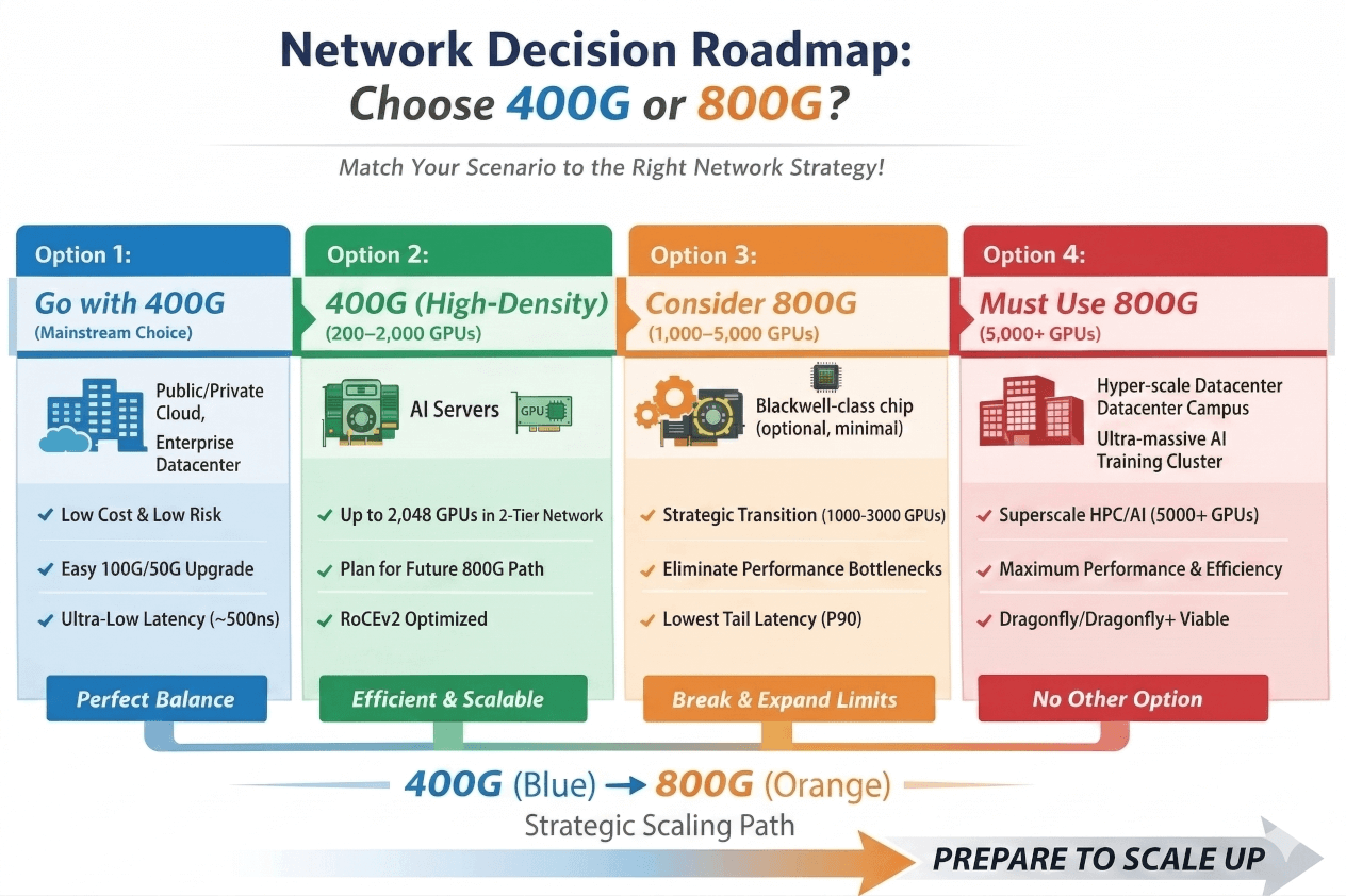 If you’re here because someone on your team is pushing for 800G “to future-proof” a 300-GPU cluster, this guide will give you the ammo to push back — or validate their case if the cluster is actually headed to 2,000+ cards. And if you’re genuinely staring down a 5,000-GPU build, we’ll show you why 400G would quietly become your biggest regret.