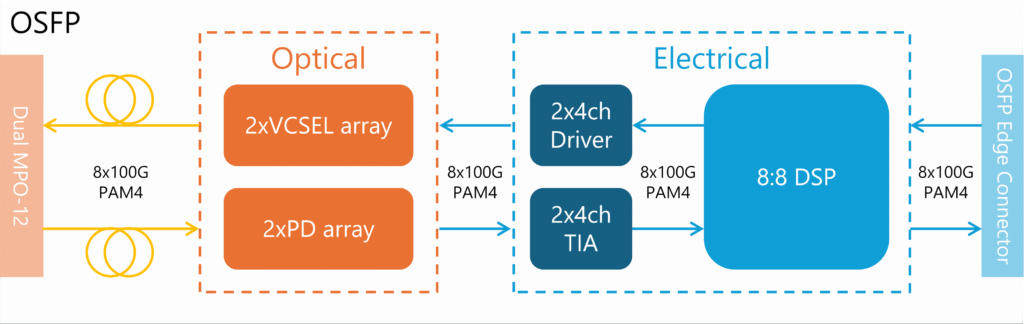 | OSFP112 | 112 Gbps × 8 | 8 | 800 Gbps | 15-20 W | 22.58 × 13 × 100.4 |
