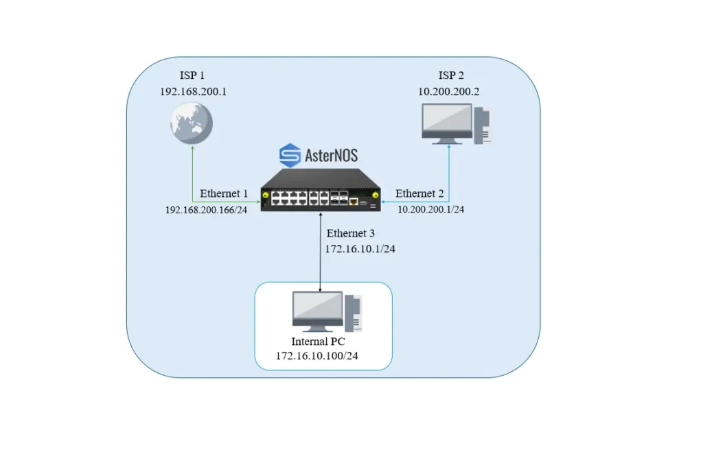 | AsterNOS (Eth1) | 192.168.200.166/24 | 192.168.200.1 | WAN — ISP line (default internet access) |