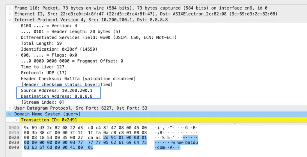 Verification: Generate traffic from the internal PC to a Baidu domain. Wireshark on the laptop (10.200.200.2) should capture the packets, confirming they were steered to the premium line.
