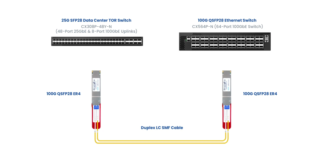 The 100GBASE ER4 standards are met by the 100G QSFP28 ER4 transceiver module. The maximum reach distance with single-mode fiber is 40 km. Real-time digital diagnostic monitoring of many transceiver and optical link parameters is supported by the 100G ER4 transceiver. Four channels of 25Gb/s electrical data are converted into four channels of LAN-WDM optical signals by this transceiver, which then multiplexes them into a single 100Gb/s optical stream for transmission. It skillfully de-multiplexes a 100Gb/s optical input back into four separate LAN-WDM optical signal channels on the receiving end. The 100GbE IEEE 802.3ba 100GBASE-ER4 and ITU-T G.959.1 OTU4 (4L1-9C1F) specifications are met by this optical module.