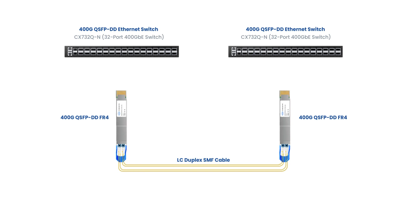 The QSFP-DD FR4 400G optical transceiver module offers a maximum of 2 km distance for data transmission. The eight 50Gb/s (PAM4) electrical input channels are able to be converted to 4x100Gb/s CWDM (Coarse Wavelength Division Multiplexing) optical signals. Then, the signals are efficiently multiplexed to form one optical transmission channel at a rate of 400Gb/s. The module is able to divide a 400Gb/s optical input into four distinct CWDM optical channels at one side of the receiver. In order to provide efficient throughput with low latency, these channels can then be converted back to eight 50Gb/s (PAM4) electrical output channels. IEEE802.3cu-2021 400G-FR4 Technical Specification D2p0, and CEI 56G-VSR-PAM4 standards are all fulfilled by the optical module 400GBASE FR4. This method is more reliable and efficient in the transmission of data over long distances because it functions equally in both directions. Data centers for cloud computing, VoIP, as well as AI/ML networks for business, all benefit from the QDD 400G optical transceiver.