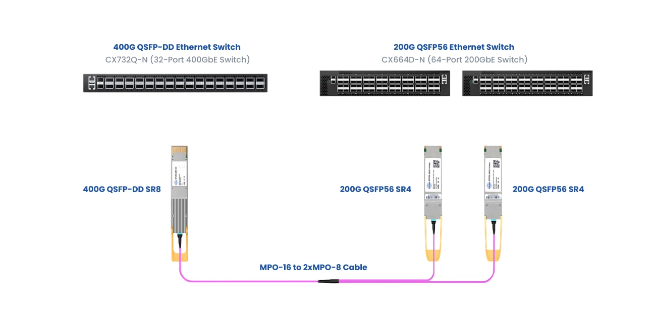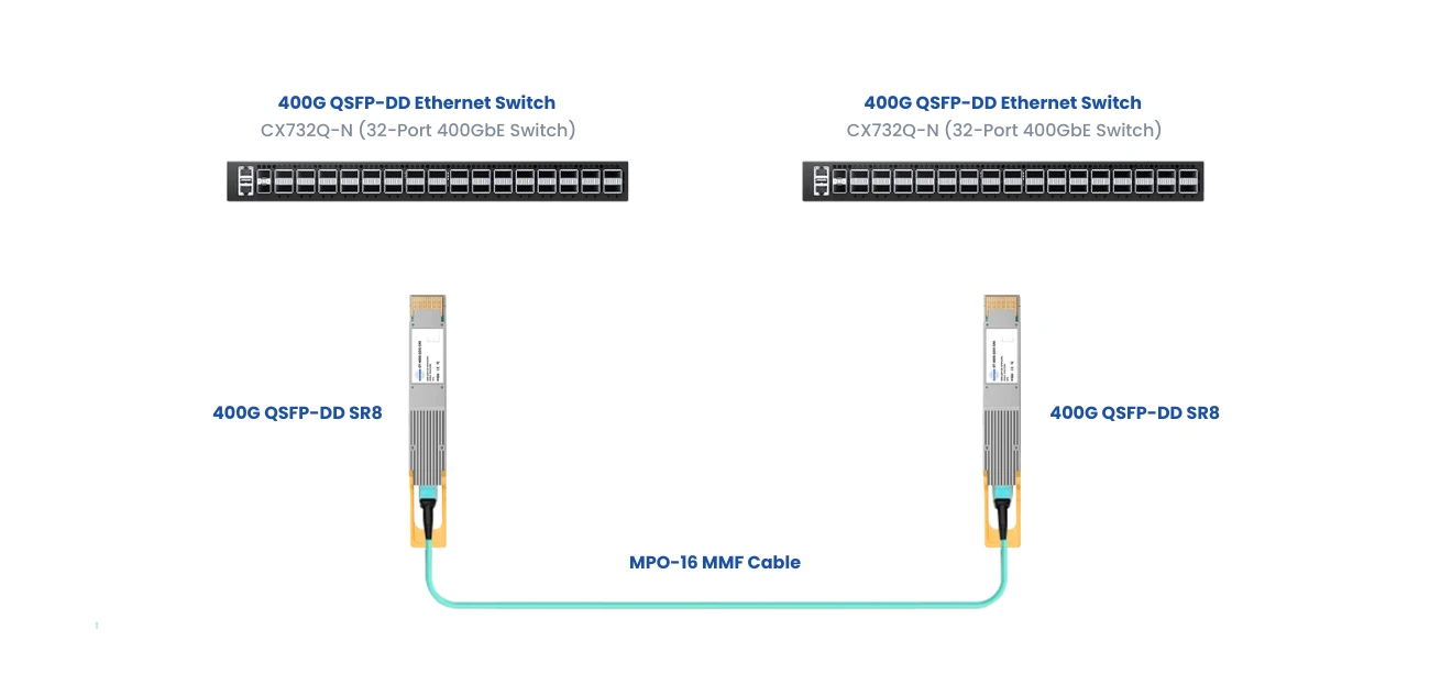 The QSFP-DD 400G SR8 transceiver supports 400G Ethernet connections in data centers, as well as other applications that require breakout connections. This optical module has eight lanes, is able to process up to 425 Gbps of data at once. Its maximum speed for each channel will be 53.125 Gbps. It can be utilized in a range of high-density networking scenarios because it can be used in a variety of configurations, from 1x 400GBASE-SR8 with 400GAUI-8, 2x 200GBASE-SR4 with 200GAUI-4, 4x 100GBASE-SR2 with 100GAUI-2, 8x 50GBASE-SR with 50GAUI-1, 2x 100GBase-SR4 with CAUI-4, 8x 25GBase-SR with 25GAUI-1.