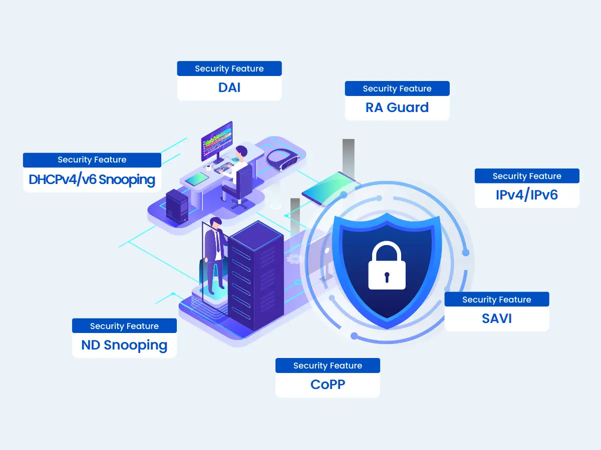 This model delivers robust L2/L3 security at the network edge and core, featuring storm control, DHCPv4/v6 Snooping, ND Snooping, RA Guard, and SAVI. With DAI, IP Source Guard (IPv4/IPv6), and CoPP, it protects against spoofing, man-in-the-middle attacks, and control plane overload—ensuring a secure, resilient network.
