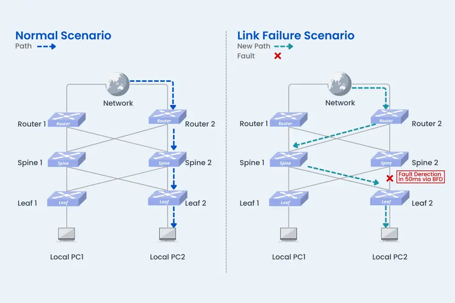 BFD-based link fault detection and sub-50ms re-routing capabilities ensure rapid, reliable failover across critical routing protocols including OSPF, BGP, and IS-IS, minimizing network downtime and maintaining uninterrupted traffic flow even during unexpected link failures.