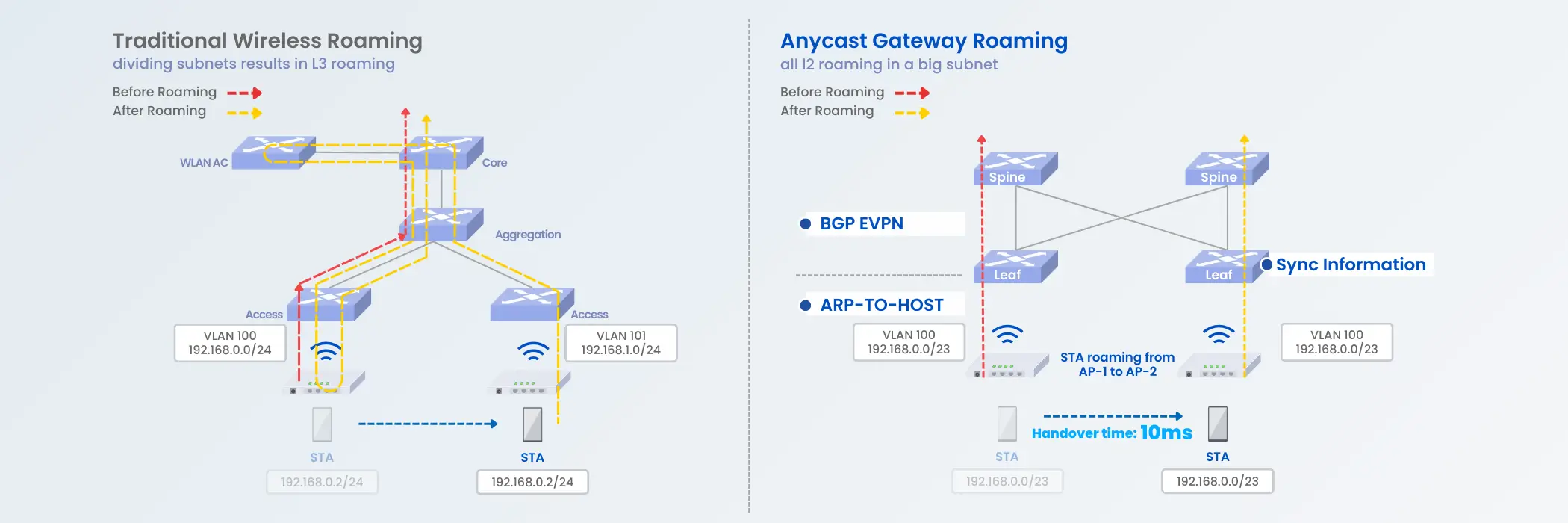 The Anycast Gateway architecture, combined with leaf switch traffic passthrough, BGP-EVPN, and ARP-to-Host, enables seamless 10ms AP roaming across the network.