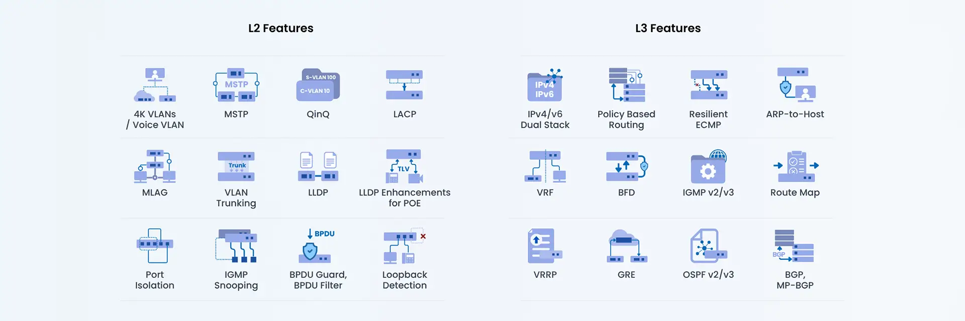 - Advanced L2/L3 network features (4K VLANs, MC-LAG, storm control, IPv4/v6 Dual Stack, BFD, etc.)
