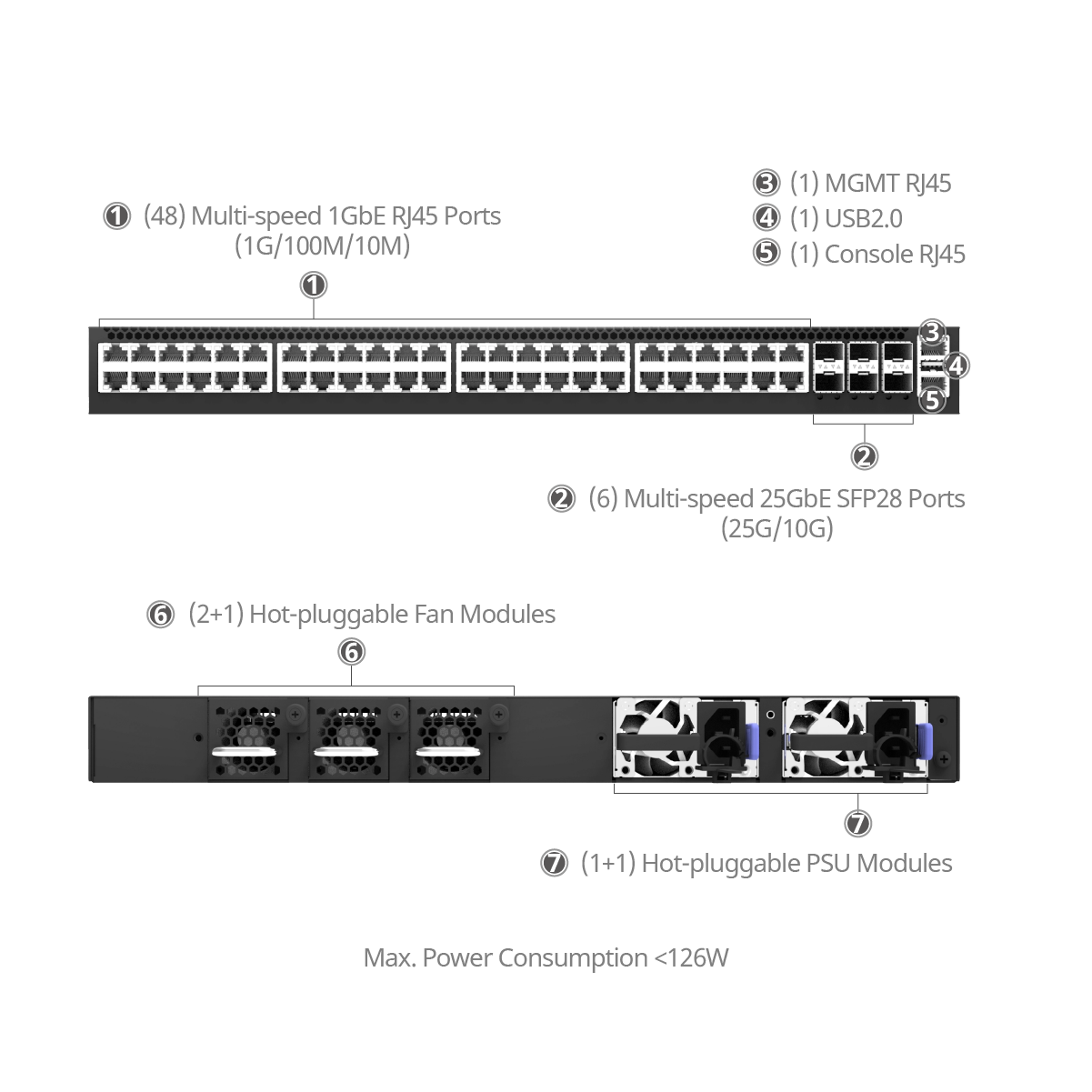 - 48x 1GbE ports and 6x 25GbE ports uplinks
