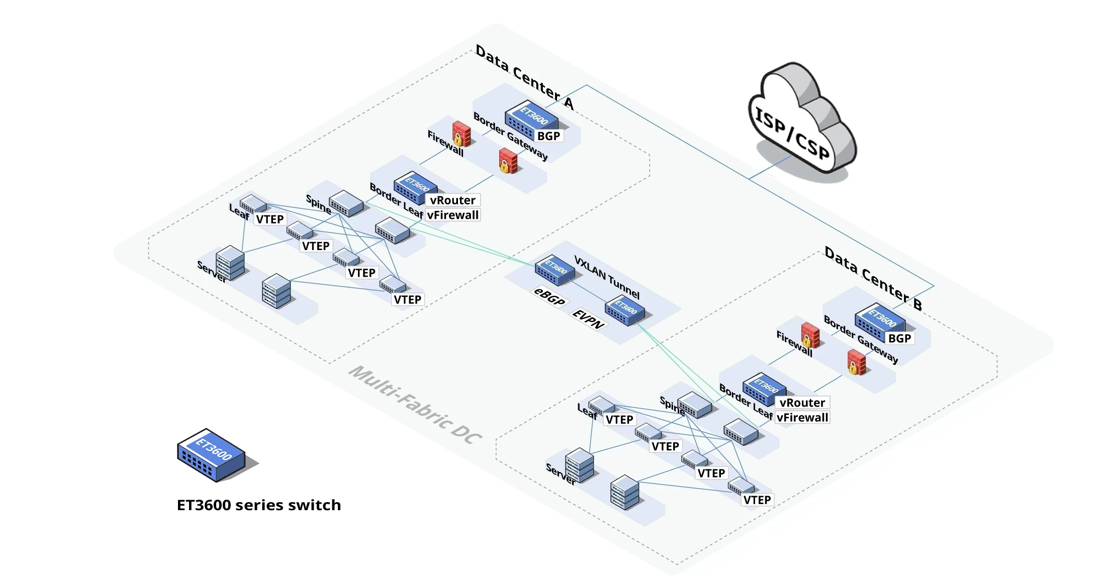 - DCI Leaf: Establishes VXLAN Tunnels for L2 extension across data centers, leveraging eBGP EVPN to support L2/L3 VPN functionalities
