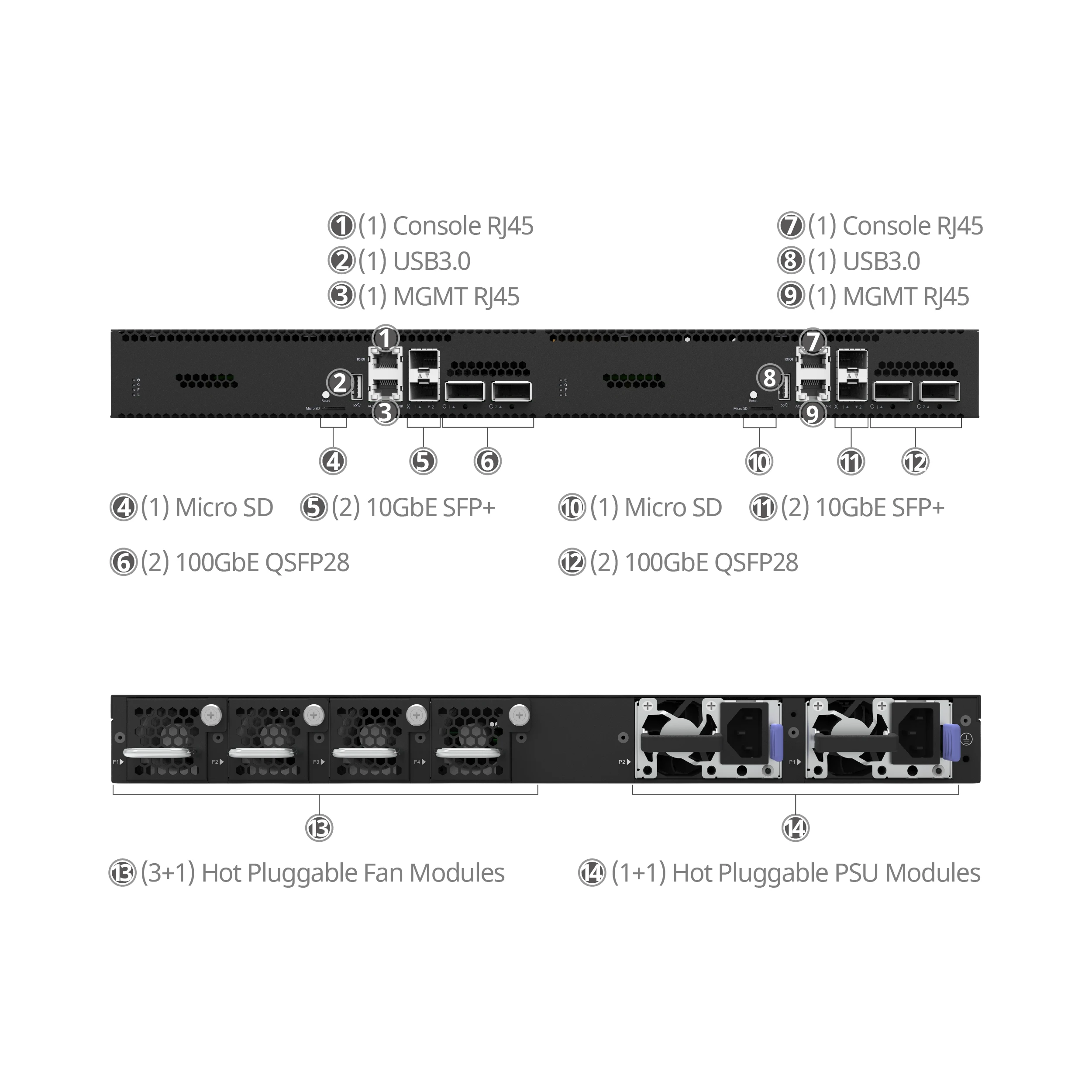 - 2 x 2 x 100GE QSFP28,2 x 2 x 10GE SFP+, optional 2 x 2 x 2.5GE RJ45