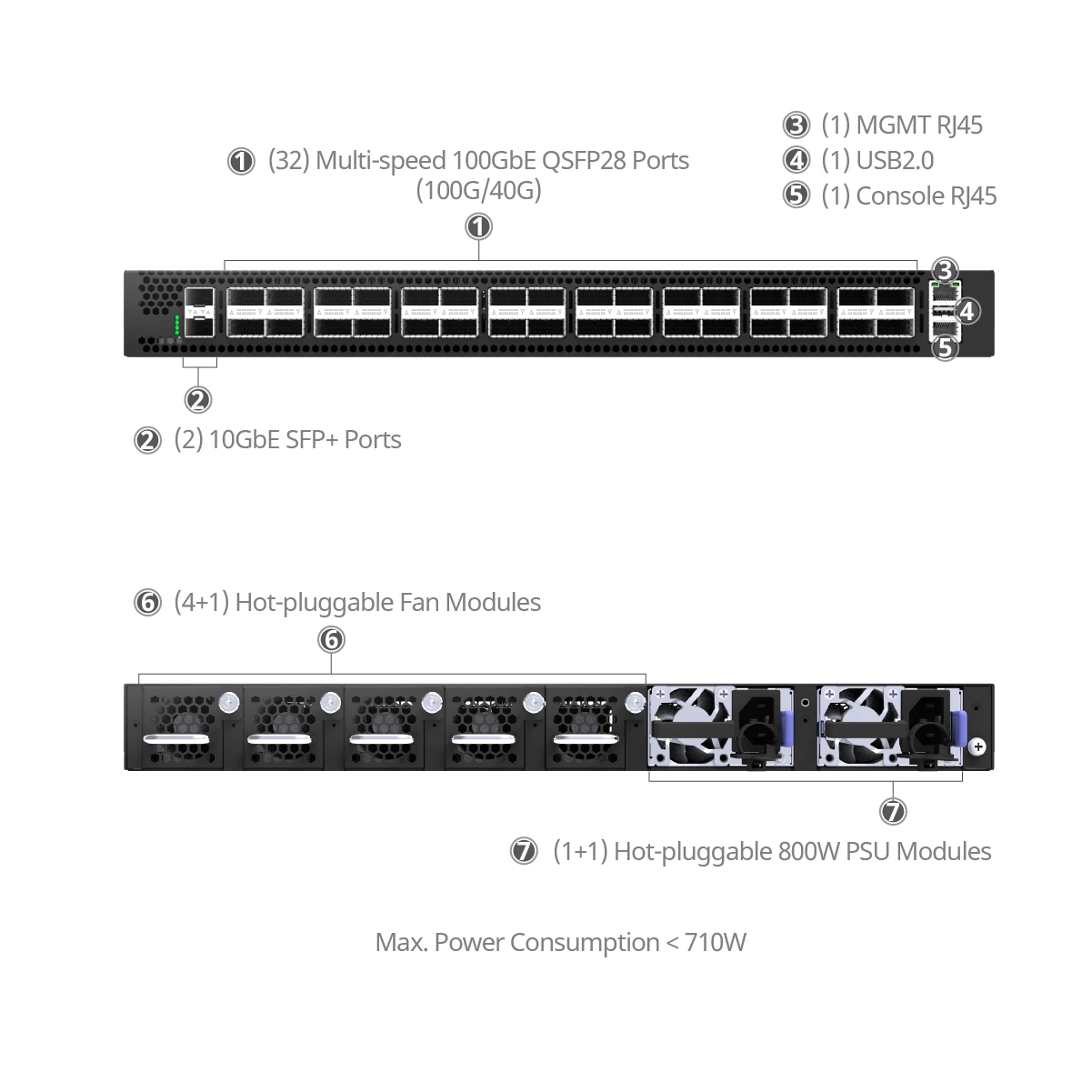 - High Throughput: With 32 x 100GbE ports, these switches offer a total switching capacity of 3.2 Tbps, enabling the smooth flow of massive amounts of data.